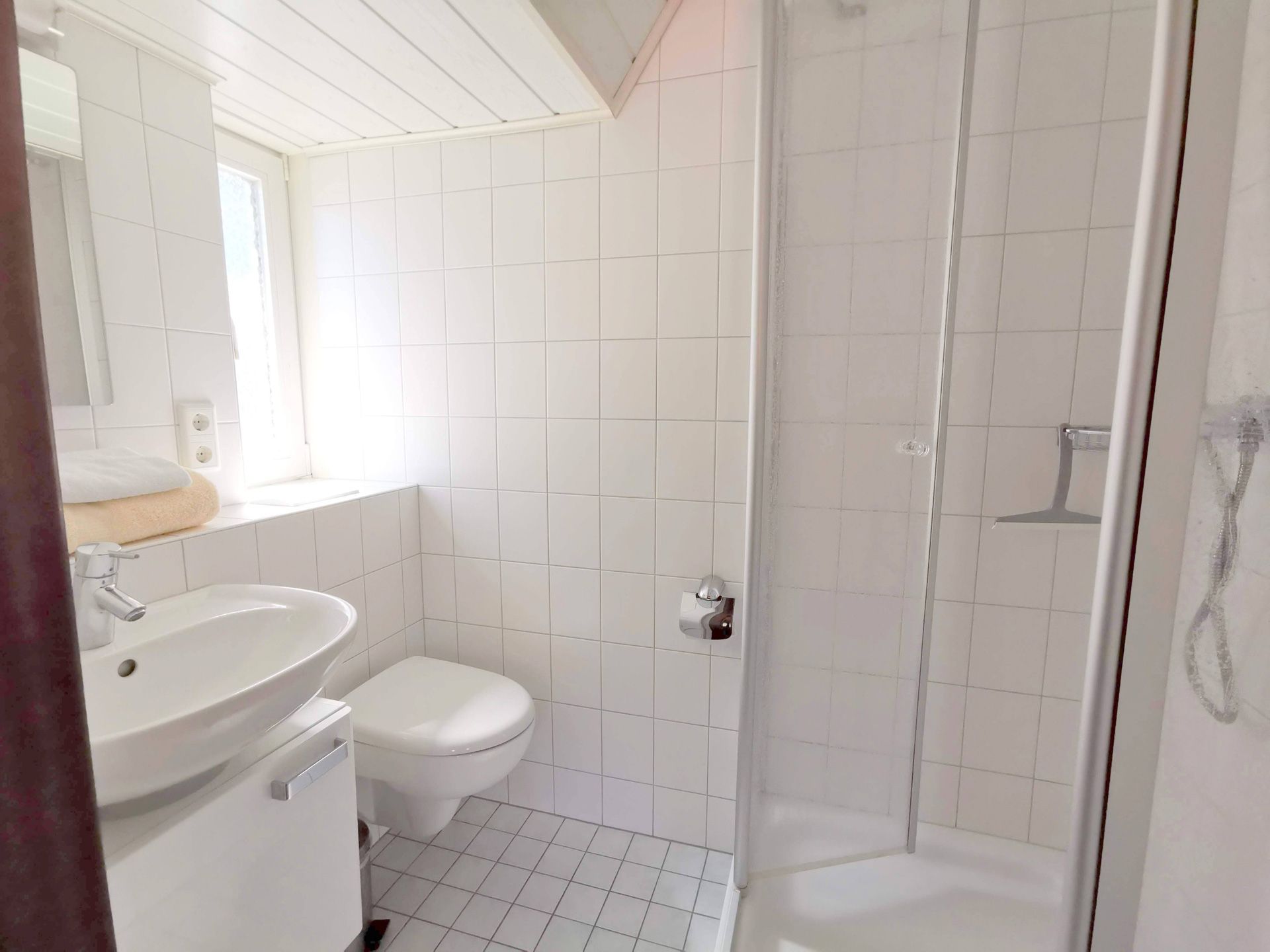 perfekt für kleine Mahlzeiten und Snacks. Ein separates, helles Duschbad mit